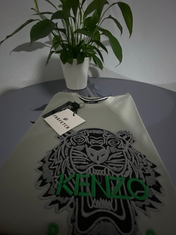 Tişört üzerinde yeşil kaplan deseni ve yeşil Kenzo yazısı bulunur. Yumuşak kumaşlı, modern tasarım.