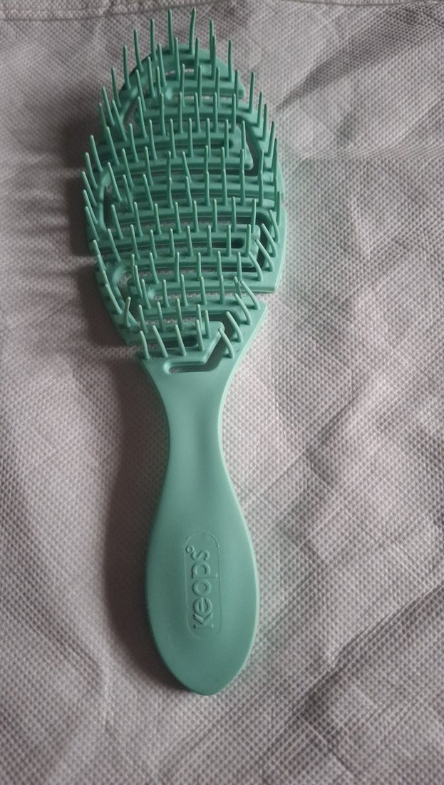 Esnek kıllara ve ergonomik sap yapısına sahip yeşil plastik saç fırçası, saçları nazikçe açmaya yardımcı olur. ♀️