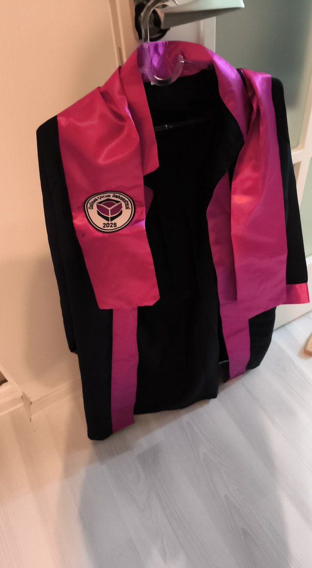 Diger markalı, uzun kollu, yakalı ve baskılı kadın mezuniyet elbisesi. Koyu pembe drapeli detaylarıyla parti için uygun, şık ve modern bir tasarım.