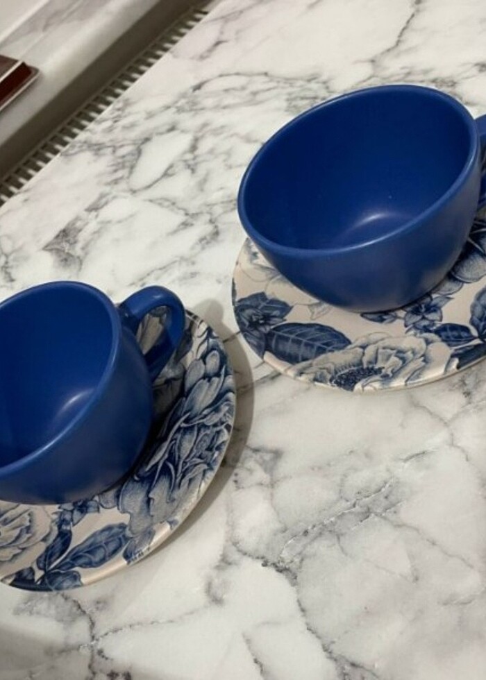 KERAMİKA 2 KİŞİLİK 4 PARÇA ÇAY SETİ. Lacivert ve kırık beyaz renklerinde, paketli, hiç kullanılmamış
