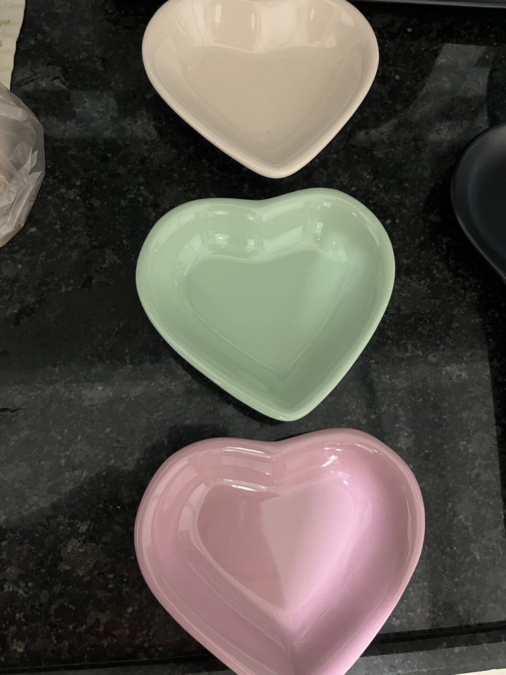 Krem, nane yeşili ve pembe pastel renklerde 3 adet kalp şeklinde kase seti.
