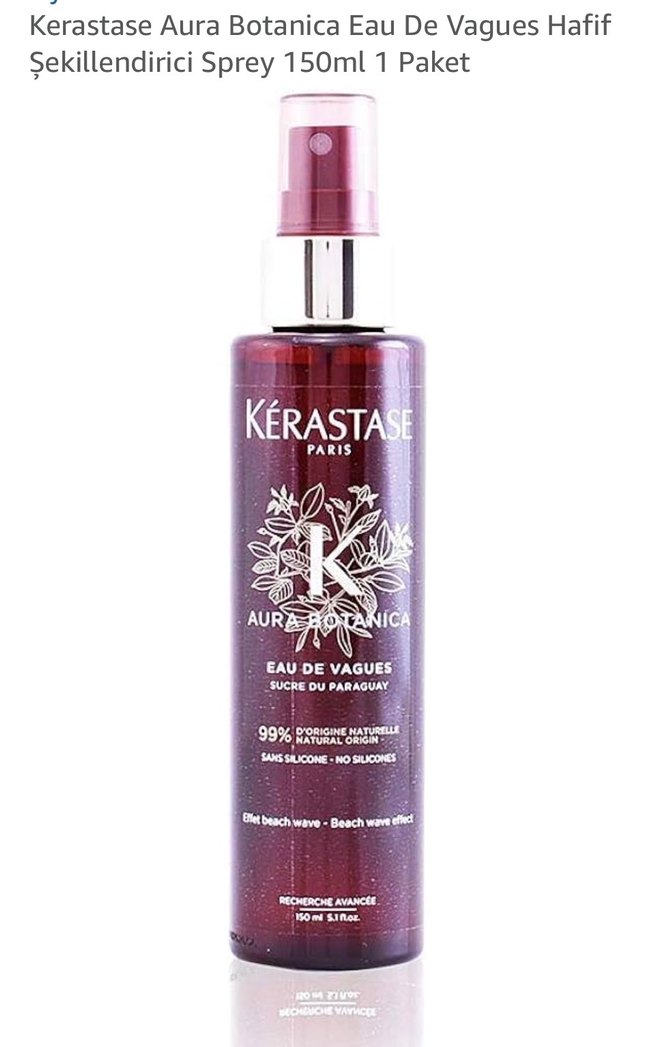 Kérastase Aura Botanica Eau de Vagues, %99 doğal içerikli, silikon içermeyen saç spreyi. Saçta plaj dalgası etkisi sağlar. Isı işlemi öncesi de uygulanır,normalde nemli saça uygulanır.Yıpranmış,cansız,mat Şaçlar için idealdir,saçları besler ve nemlendirir.