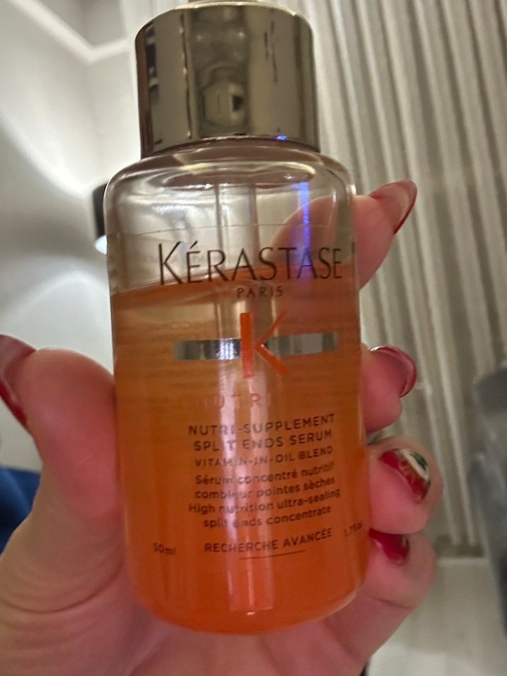 Kérastase Nutri-Supplement saç serumu, saç uçlarını besleyip onarır. 50ml şişede sunulur. Görüldüğü kadar kullanıldı, %80-90 dolu