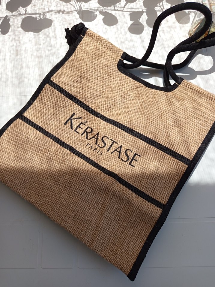 Sentetik kumaştan yapılmış, elastik detaylı kahverengi bohem tarzı çanta. Üzerinde Kérastase Paris baskısı bulunur, günlük kullanıma uygundur. Hasır ipli dokuma gibi.