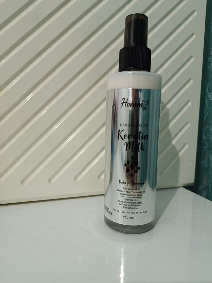 Keratin ve kolajen içeren, saçları yumuşatan ve koruyan 200 ml keratin sütü saç bakım spreyi.
