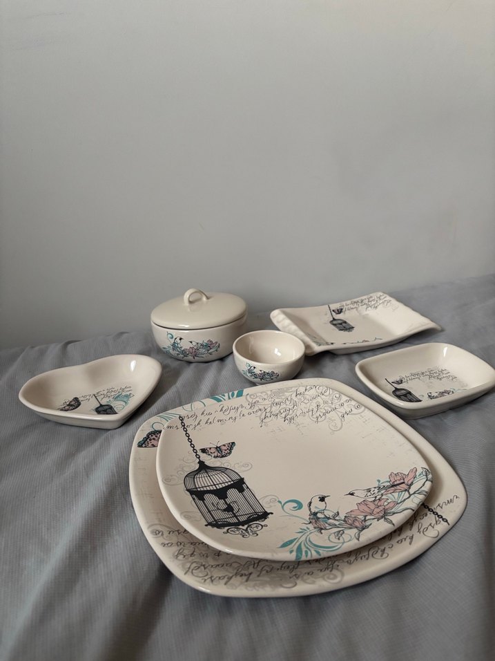 Beyaz seramikten yapılmış, kuş ve kafes desenleriyle süslenmiş kahvaltı takımı, farklı tabak şekilleri ve kapaklı kase içerir. ️