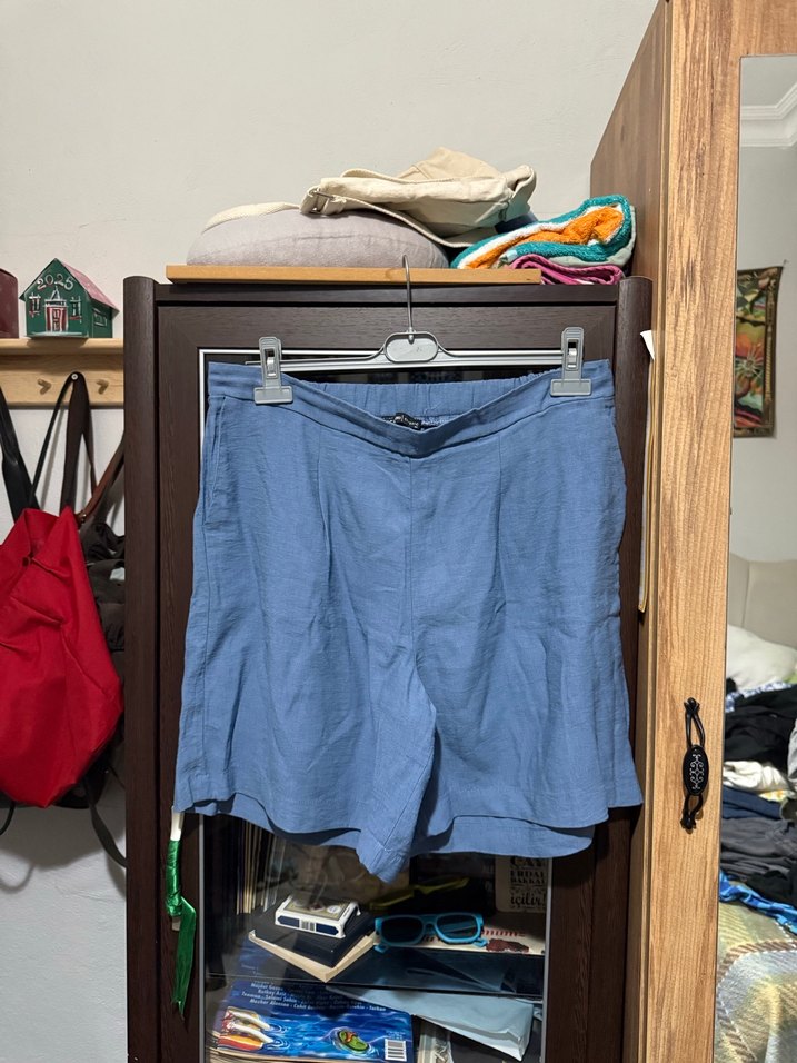 Hafif kumaştan yapılmış, rahat kesimli mavi kadın şort. Hafif dalgalı eteğiyle günlük kullanım için uygundur. çok rahat, bol kalıp.