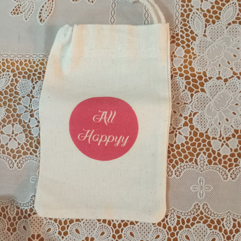 Beyaz renkte, pembe daire içinde "All Happyy" yazılı pastel baskılı Yumuşak kumaşlı, ipli kapama özellikli.