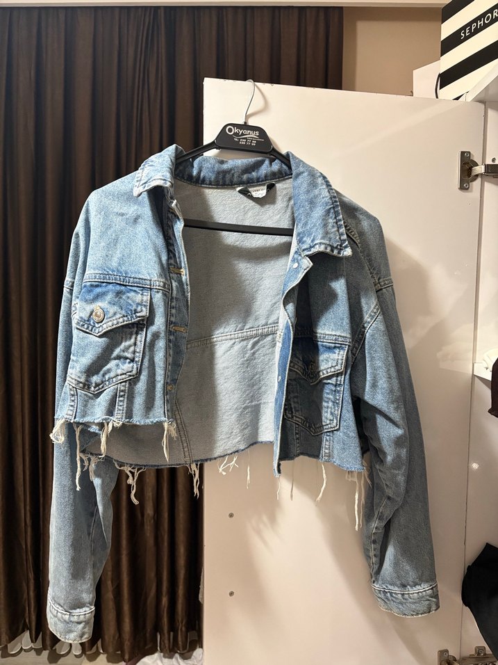 Bu bol kesim kot ceket, uzun kollu ve düğmeli olup, yakası kesik ve mavi renktedir. Günlük kullanım için uygun, sokak stili rahat bir parçadır.