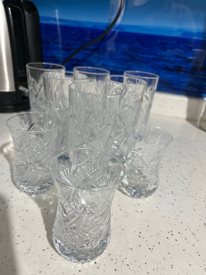 İçecek servisi için uygun, ayrıntılı desenlere sahip kesme cam bardak seti. Klasik tasarımlı, detaylı gravürlü bardaklar. Hepsinin fiyatıdır