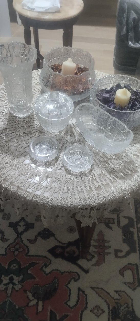 Kesme (kristal) vazo, kapaklı şekerlik, 2 büyük meyvalık, küçük gondol ve 2küçük kültablası mevcuttur
