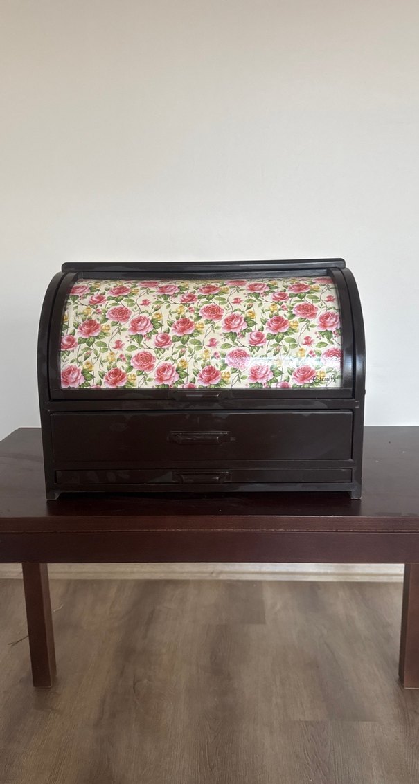 Ahşap , kesme tahtası bulunan. Çekmeceli çiçekli desenleri olan mutfağınıza çok yakışacak çok kullanışlı ekmeklik.