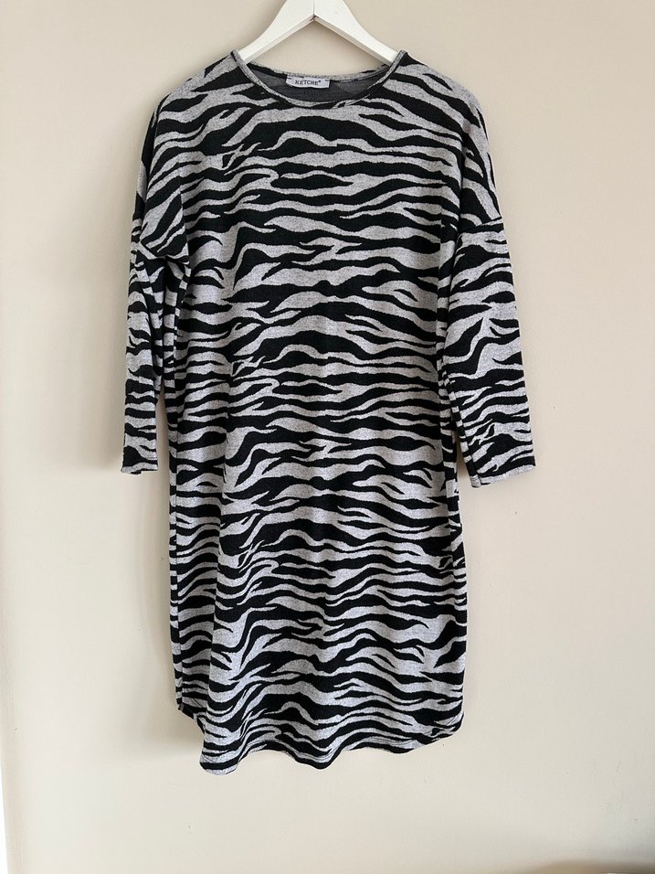 Uzun kollu, salaş kesim ve tekne yaka gri zebra desenli kadın midi tunik. Yumuşak sentetik kumaştan, kürk detaylı, günlük rahat kullanım için uygun. boy 100cm gogus 65cm