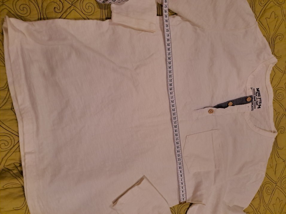 Mudo rahat keten kırık beyaz , düğmeli ve denim detaylı üst. Desensiz sade tasarımda, etiketi bulunur. Trendy günlük stil için uygundur.