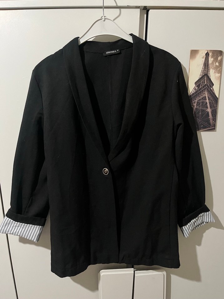 Düğmeli, siyah keten kumaştan yapılmış, normal boy midi uzunluğunda blazer ceket. Uzun kollu, yaka kısmı kesiklidir, iç manşetleri çizgilidir.