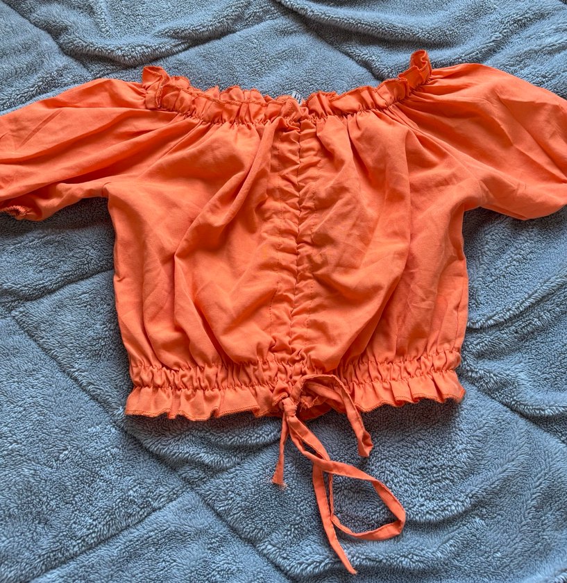 Turuncu renkte, fırfırlı ve kayık yaka kısa kollu mini keten bluz. Salaş kesimi ve rahat dokusuyla günlük kullanıma uygundur. s/m/l