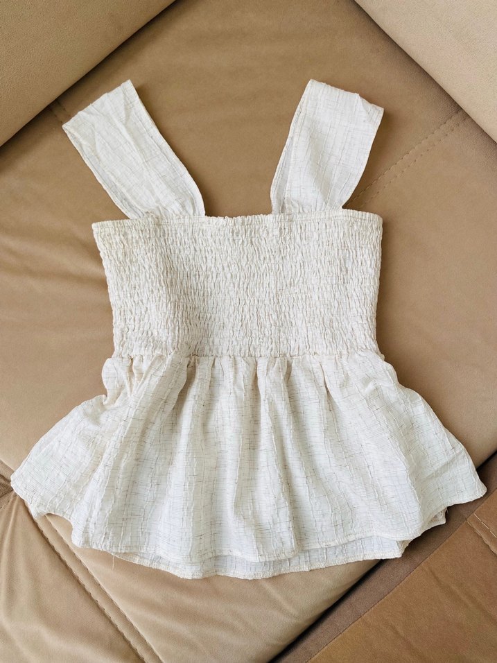 keten kumaştan, straplez yakalı ve fırfırlı detaylı, bol kesim bohem tarzda beyaz bluz.