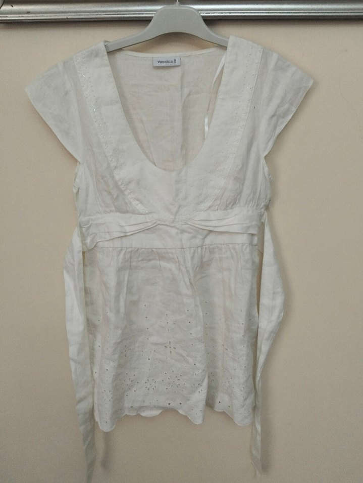 Kolsuz, V yakalı beyaz bohem keten bluz, bol kesim ve kısa boyda. Minimalist tasarımıyla günlük kullanım için rahat ve şık bir tercih. Beden yazmıyor S beden uyumlu yandan fermuarlı...