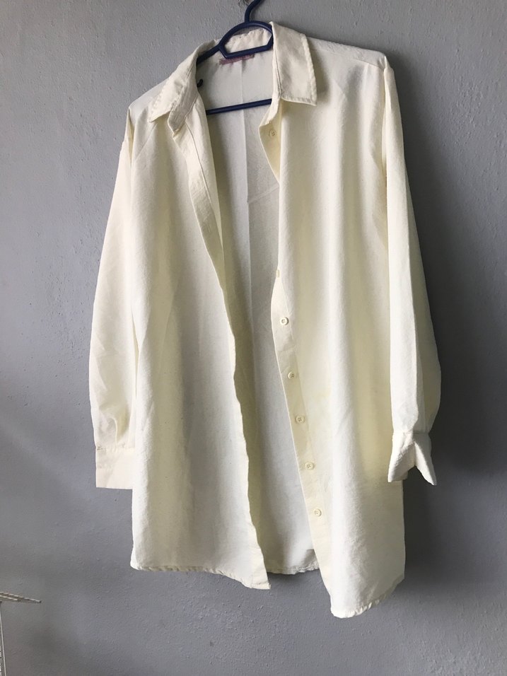 keten tunik, düğmeli ve kesik yaka detaylıdır. Uzun kollu, bol kesim ve midi boyda, minimal ve normcore tarzda günlük kullanım için uygundur.