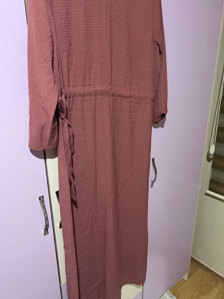 Bordo renkli, keten kumaştan uzun, bol kesim elbise. Pilili detaylar ve yakası çıtçıtlıdır, askılı kolludur. Günlük rahat kullanıma uygundur.
