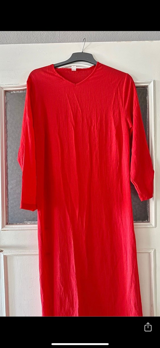 uzun kollu ve V yakalıdır. Yumuşak keten kumaştan yapılmış, bol ve uzun kesimdir, günlük kullanıma uygundur. Aldım ama hiç giymedim yeni ince rahat bir kumaşa sahip İki koltuk arası 110 cm Boy uzunluğu 137 Nar çiçeği rengine sahip