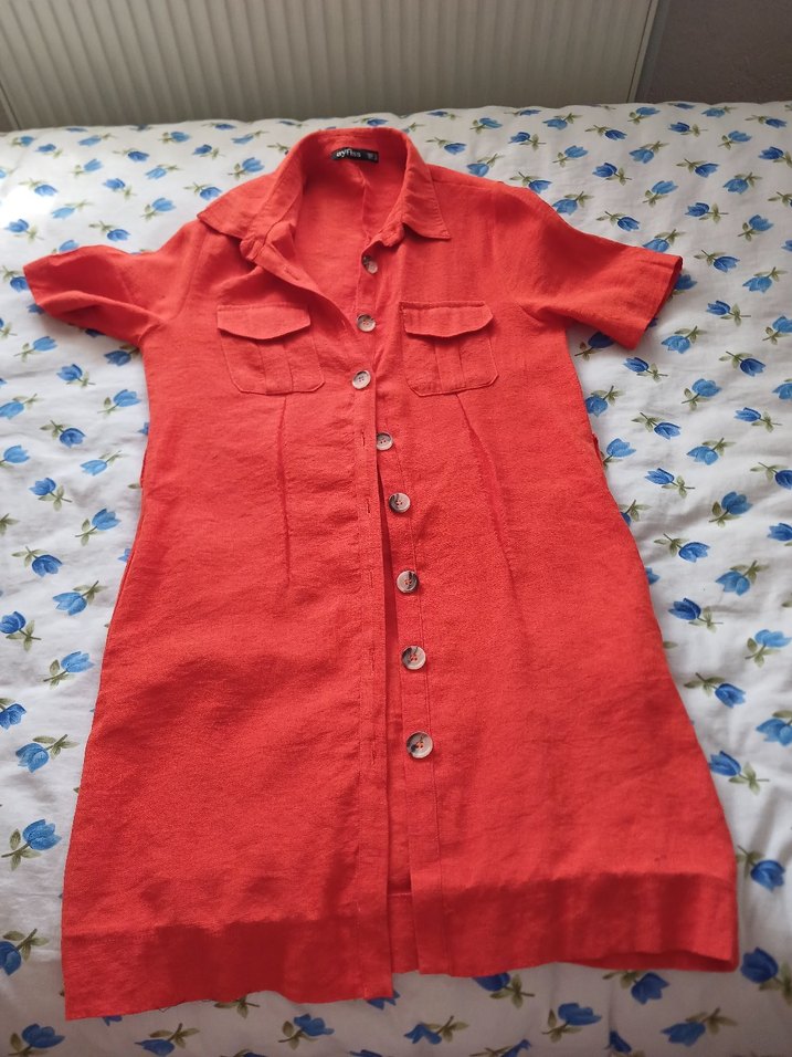 Kırmızı keten midi elbise, yakalı ve düğmeli önde. Kısa kollu ve bol kesim, rahat ve şık bir günlük stil için uygun.turuncu renktir elbise homlek tumik ger türlü kullanilir çok sik