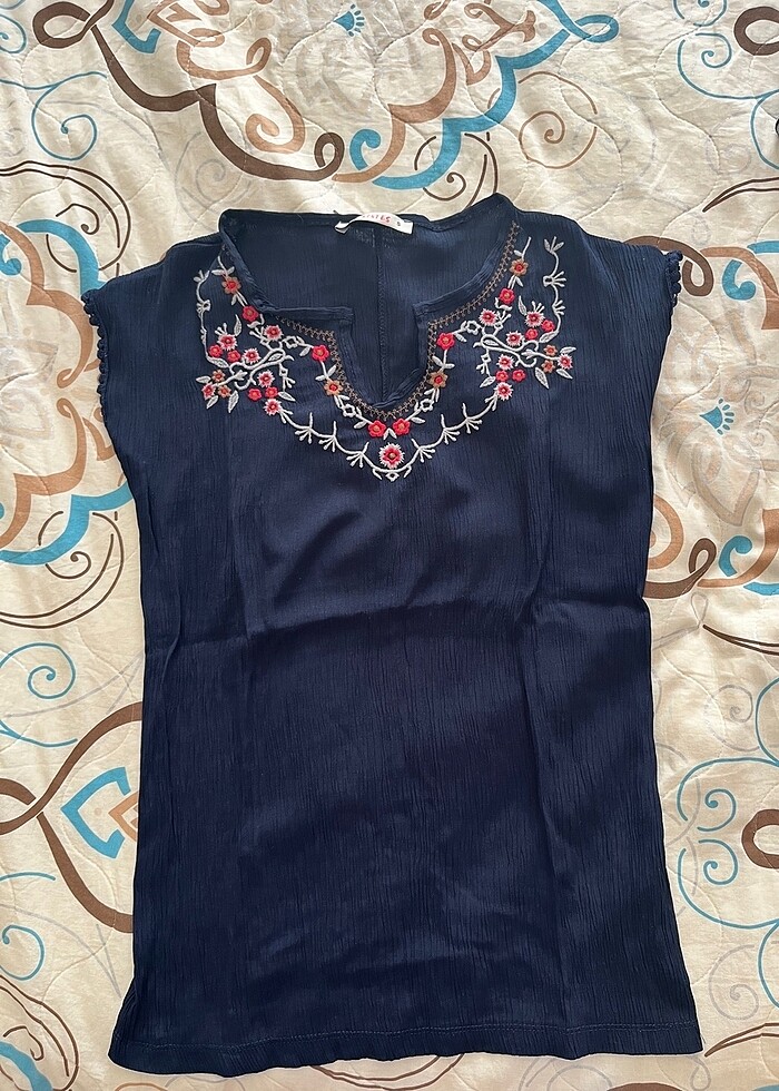 Hiç bir problemi yok çok güzel duruyor etnik desenlere sahip bir bluz