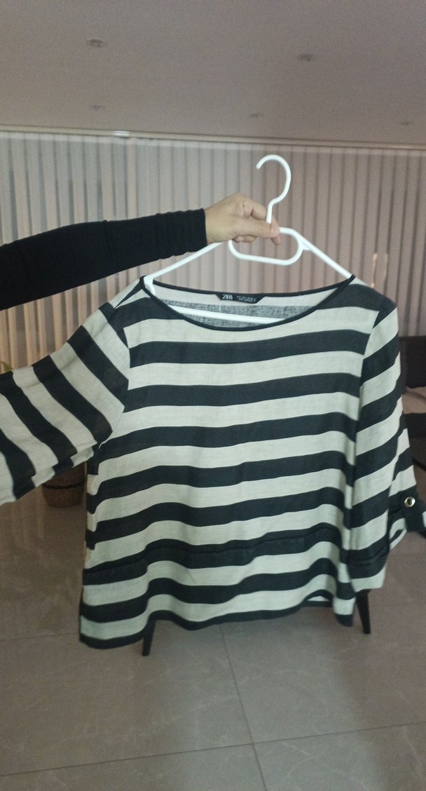 Gri çizgili, düğme detaylı, pamuklu kumaştan, uzun kollu, salaş kesim hamile tişörtü. Rahat ve günlük kullanıma uygun.bir kere giyildi.siyah beyaz çizgili