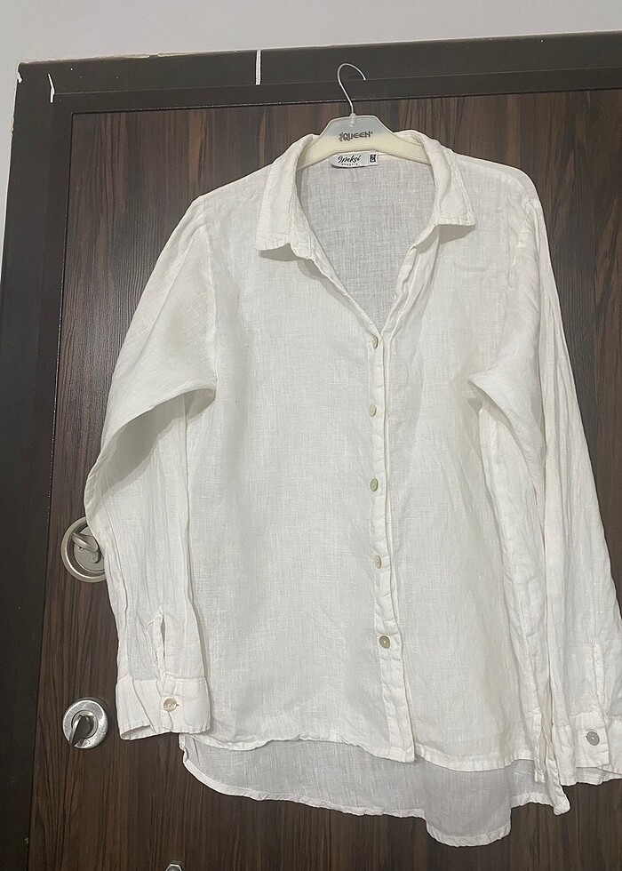 Bir kolunda düğmesi yok kıvrılan yerde sitede 2370 tl saf keten gömlek