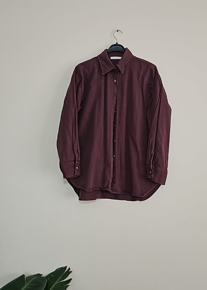 Pamuklu keten gömlek oversize kesim hiçbir kusuru yok rengi mürdüm eriğin rengindedir