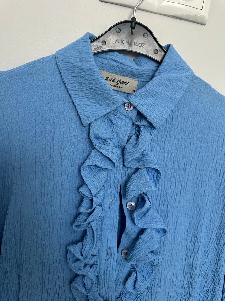 Mavi keten kumaştan, yakalı ve önü fırfırlı, Özel tasarım gömlek 2 defa giyildi