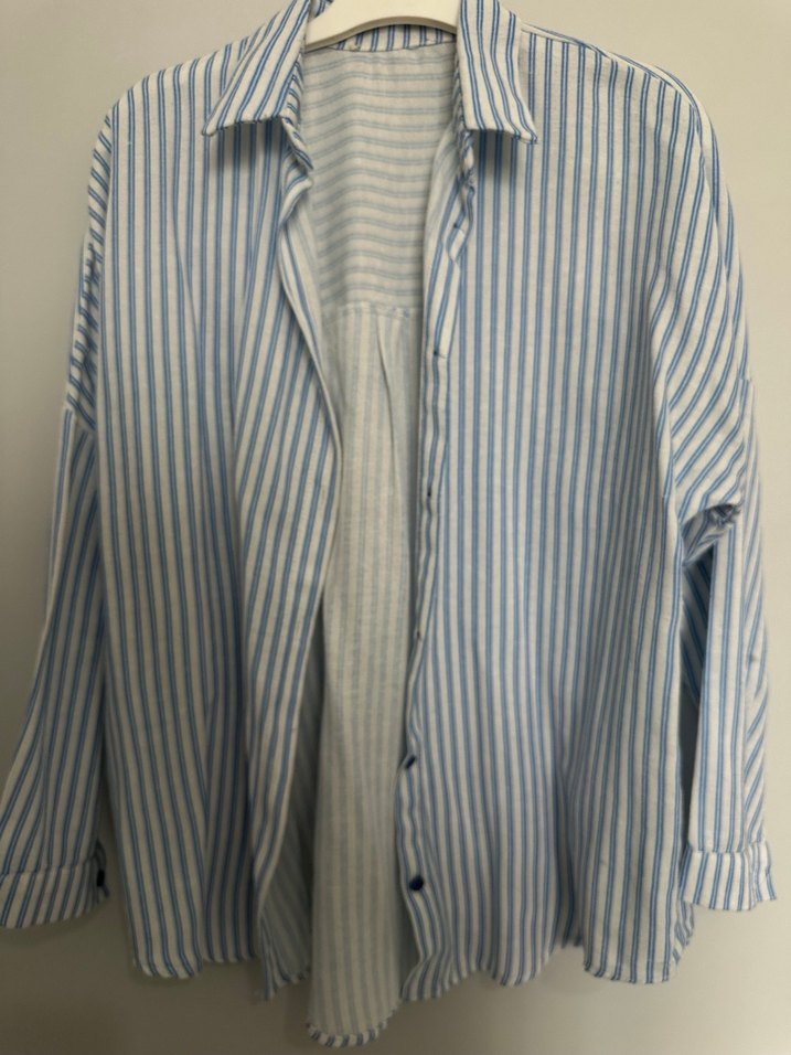 Mavi çizgili keten gömlek, uzun kollu ve yakalıdır. İnce değildir kış için kullanılabilir. Bir kaç kez giyildi