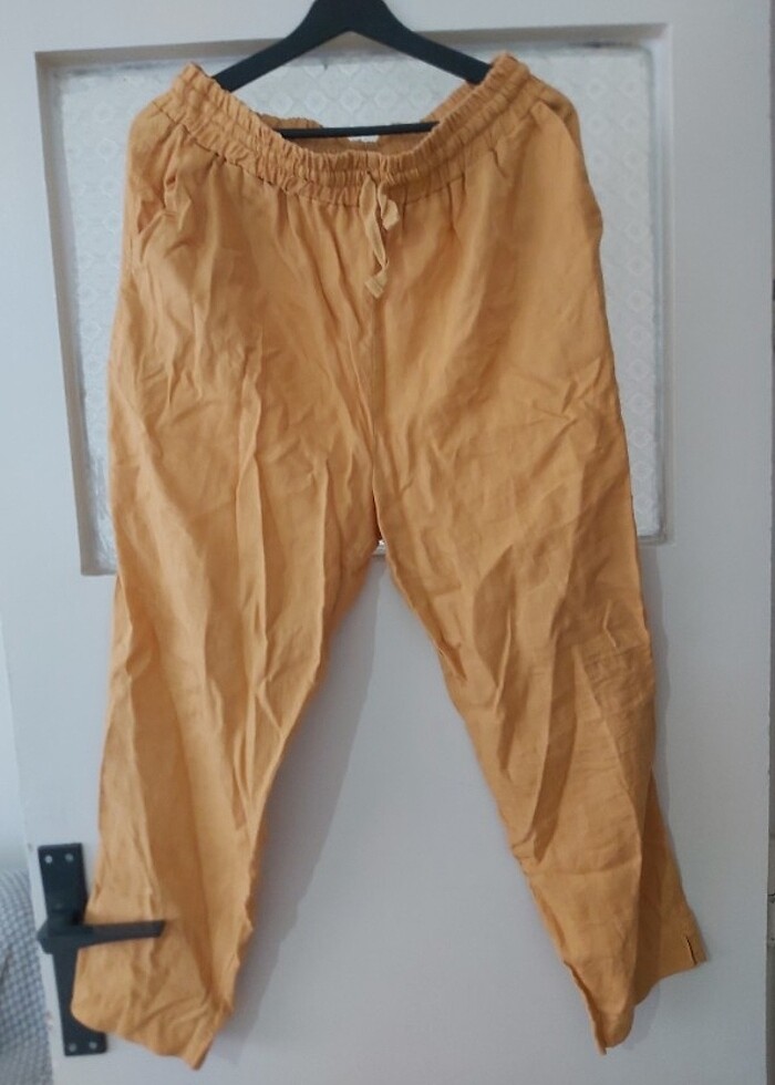 Keten Havuç Kesim Pantalon.çok şık rahat spor. havuç kesimi yakıştıramadım. hiç giymedim. bir butikten almıştım.hardal sarı gibi. dore gibi