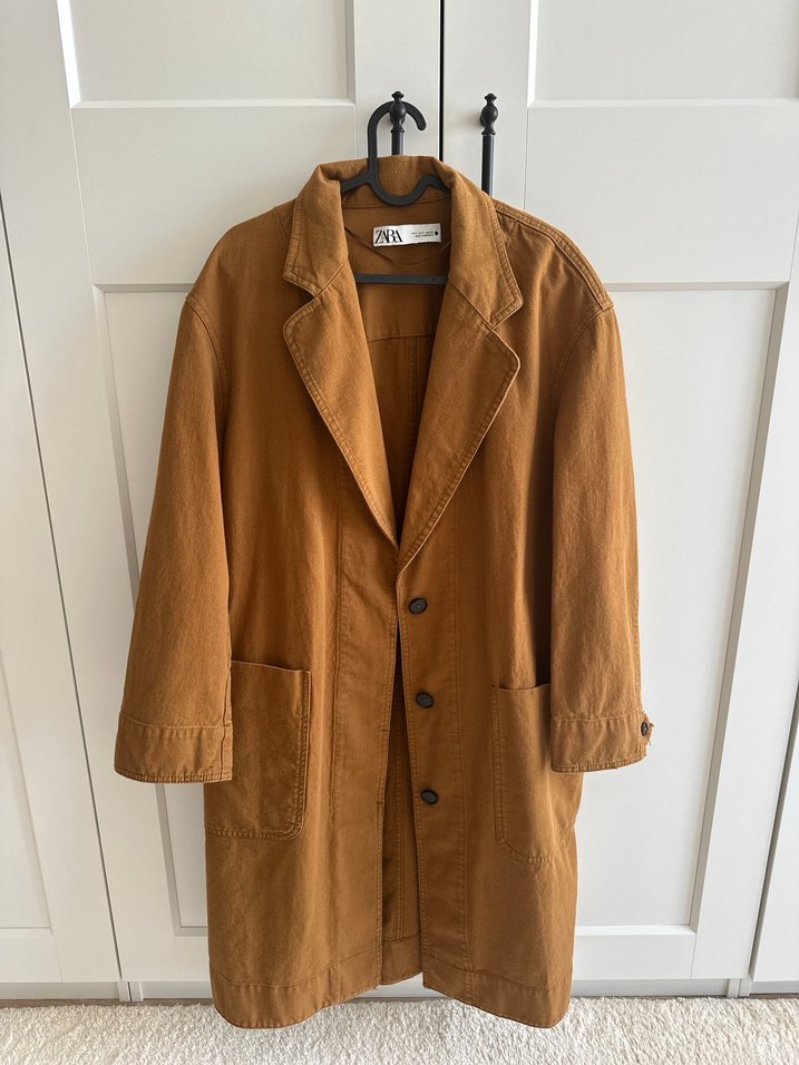 Bej renkli, keten kumaştan üretilmiş, normal uzunlukta midi kadın kaban. Çentikli yaka, düğmeli kapama, uzun kollu ve rahat kesimlidir. Minimalist tarzda, günlük kullanıma uygundur.