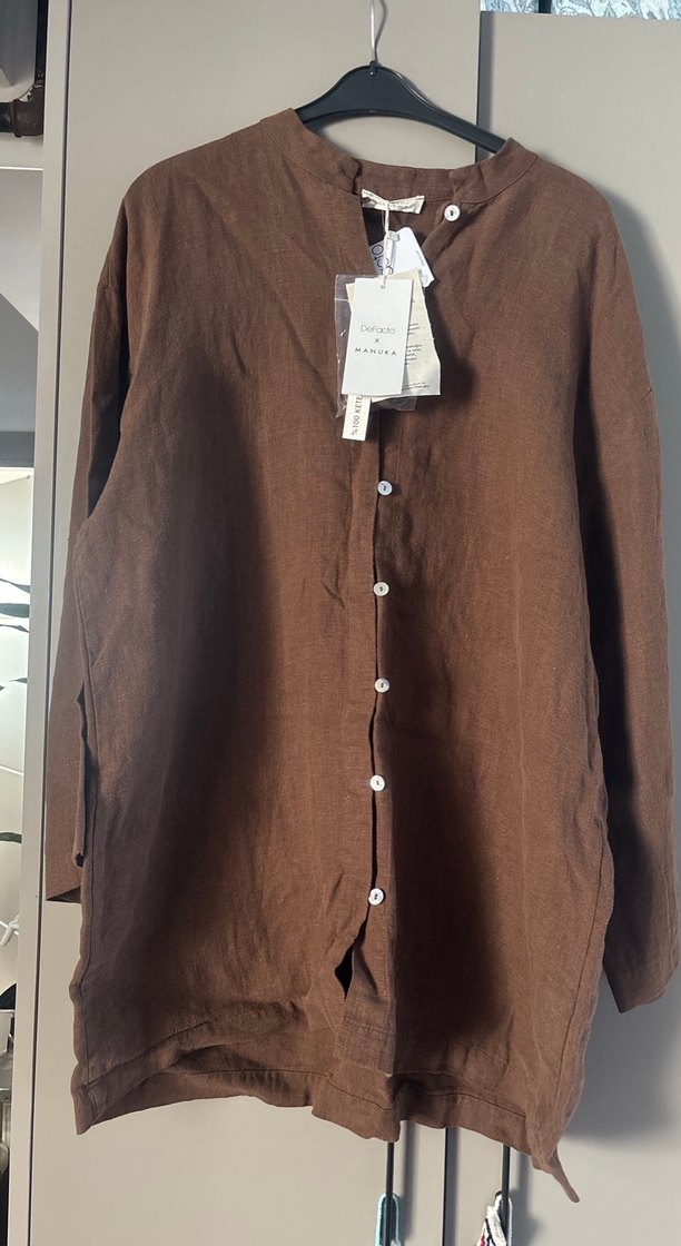 Düğmeli ön kapama, uzun kollu ve yakası kesik detaylı kahverengi keten gömlek. Bol kesim ve midi boy ile günlük rahat kullanıma uygundur. %100 ketendir