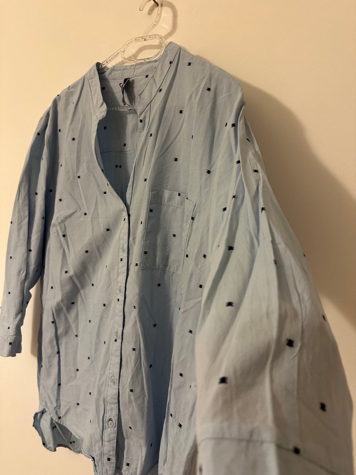 Mavi keten kumaştan, nakışlı desenli, düğmeli, yakalı ve uzun kollu, rahat kesim kadın gömleği. Günlük kullanım için uygundur.