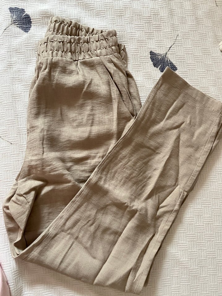 Bej renkte, ketenden yapılmış, rahat kesimli kadın pantolon. Elastik bel bantlı, gündelik ve sokak giyimine uygun, zahmetsiz şıklık sunar. 36 beden