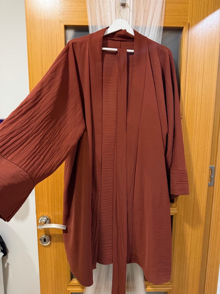 Kadınlar için uzun, bol kesim, yumuşak keten kumaştan yapılmış koyu kiremit kimono. Özel dikimdir 40-46 beden arası uygundurğ