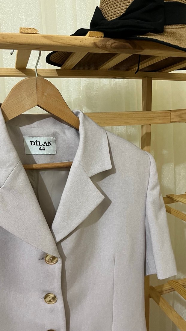 keten kısa kollu kadın blazer ceket, kesik yaka ve düğmeli ön detaylı.dar kalıp