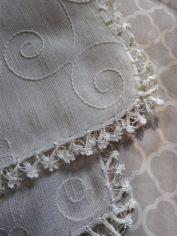 Yumuşak keten kumaştan, dantel kenar detaylı ve hafif spiral desenlere sahip vintage bohem tarzında 120×120 ölçülerde runner