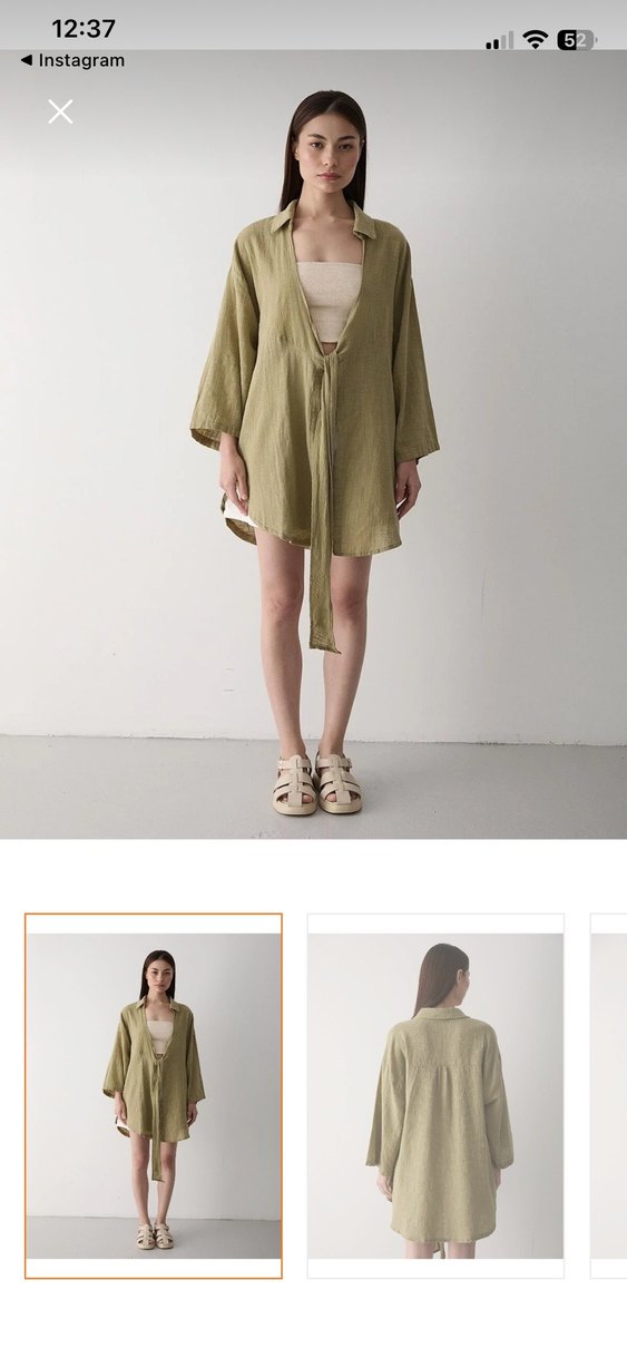 Haki renkte, keten kumaştan kısa ve bol kesim kadın kimono. İnce askılı ve V yakalı, gündelik kullanıma uygun sade ve şık tasarım.