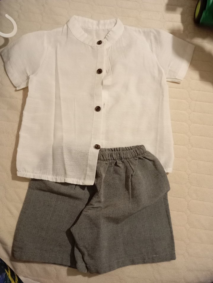 Beyaz keten kısa kollu, düğmeli ve yakası kesik detaylı gömlek ile gri lastikli şorttan oluşan bebek erkek takımı.