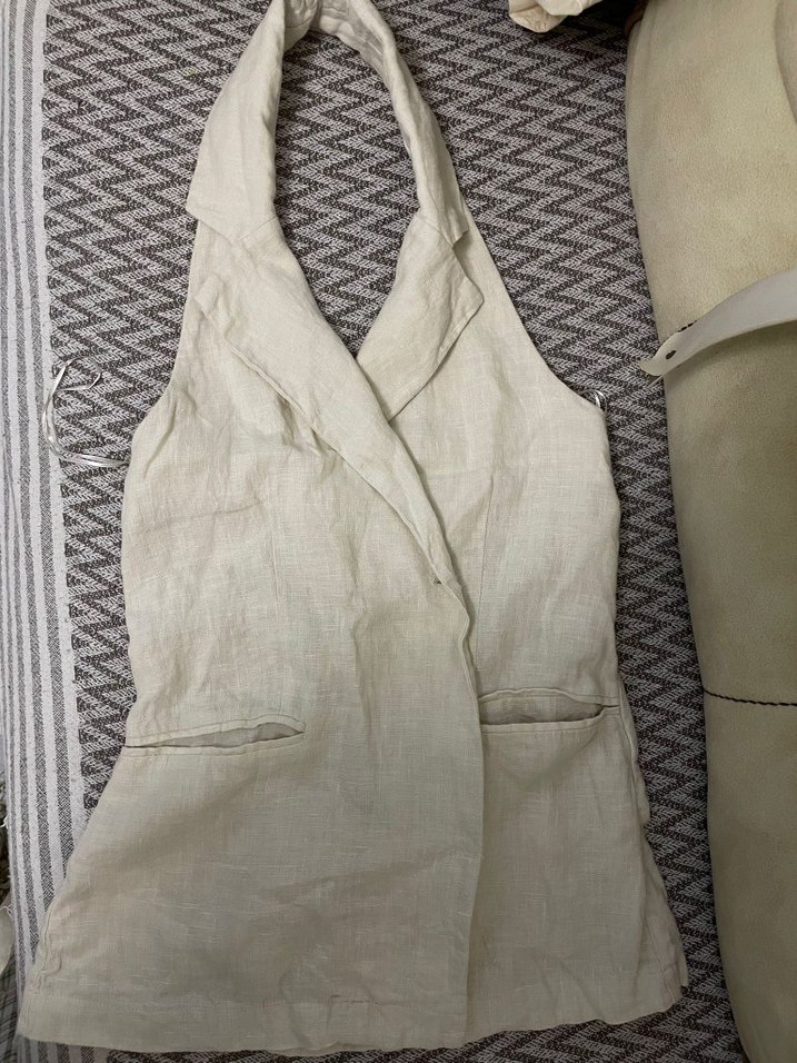 Keten Kumaşlı Bej Halter Yaka Kadın Yelek