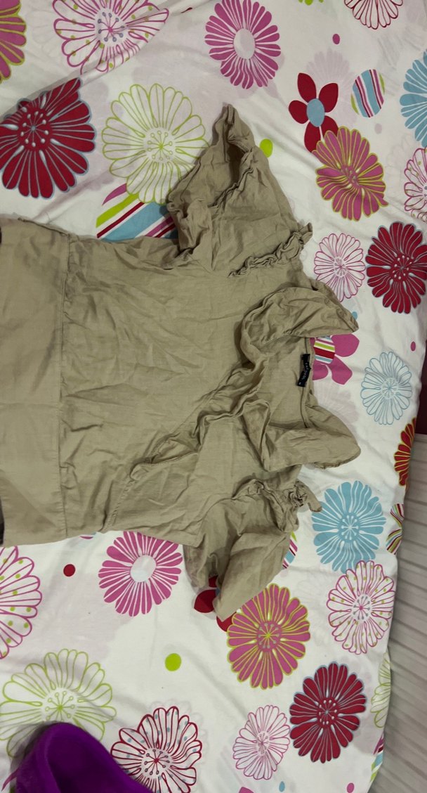 Keten kumaştan yapılmış, askısız yakalı ve fırfır detaylı, vücuda oturan askısız hamile bluzu. Bej rengindedir ve günlük kullanıma uygundur.