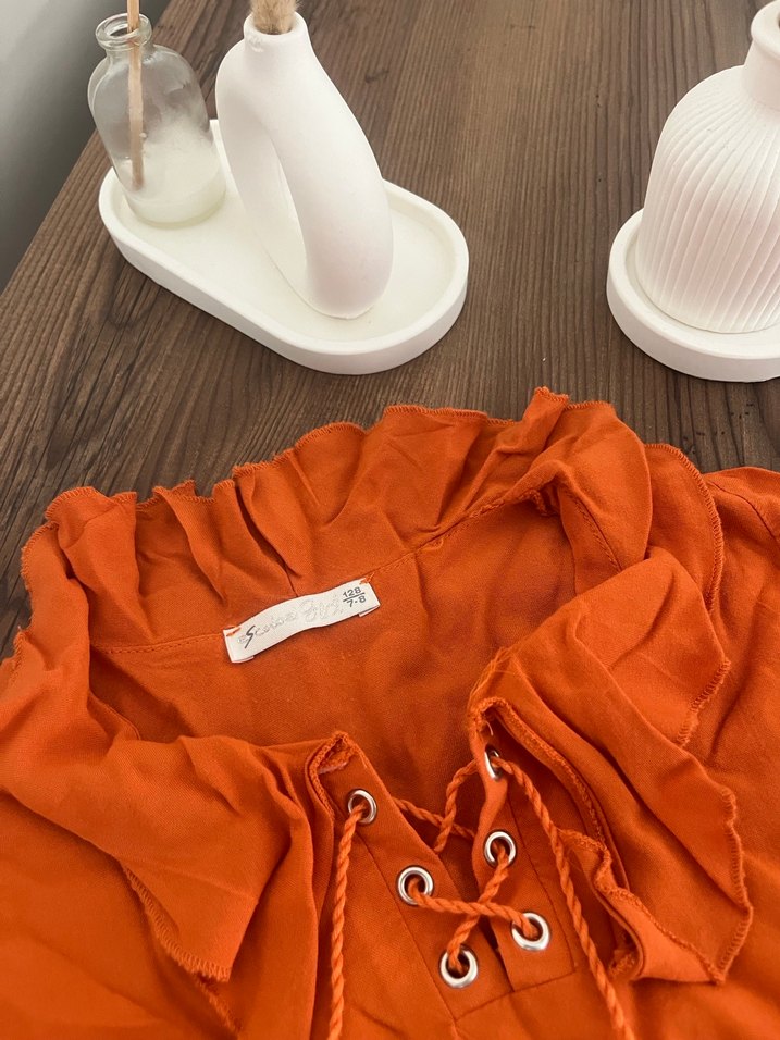 Kahverengi keten kumaştan, uzun kollu, fırfırlı ve salaş kesim bluz. Tekne yaka ve kısa boyda, baskılı bohem tarzda. Günlük kullanıma uygun. 7-8 yaş uygundur. Az kullanıldı. Sorun yoktur.