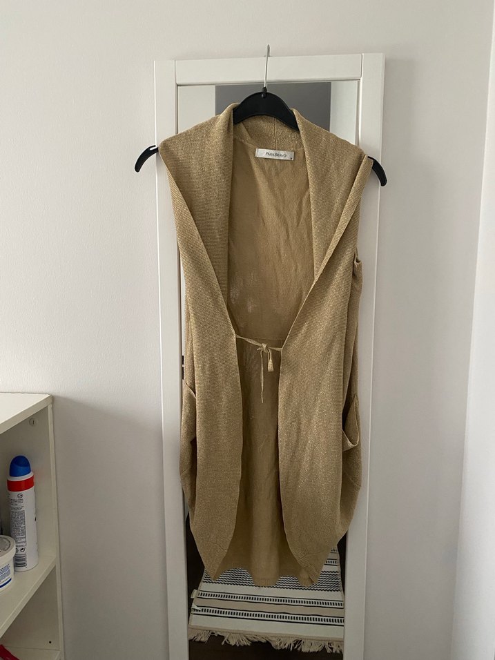 Keten kumaştan, kemerli, bej renkli, normal uzunlukta, kolsuz ve bol kesim yelek. Bohem tarzda, günlük kullanıma uygun.