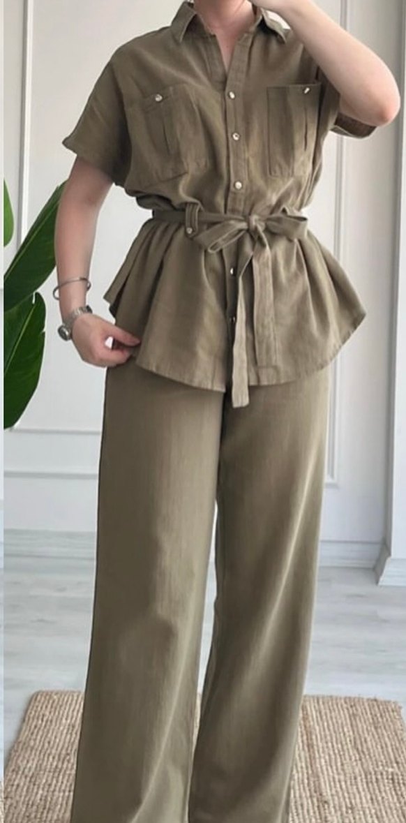 Keten kumaştan, kemerli ve midi boy, bol kesim kadın takımı. Strappy kollu ve yakası kesik, günlük sokak stiline uygun. ✨