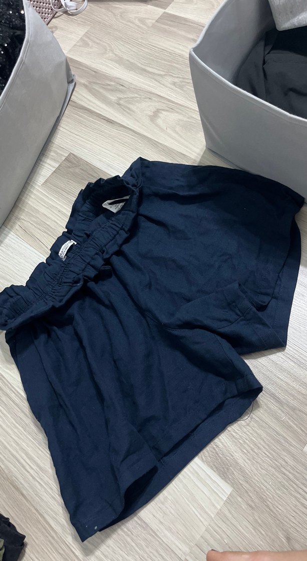 Yumuşak keten kumaştan yapılmış, bol kesim koyu mavi şortu. Fırfırlı bel ve kısa mini boy ile günlük sokak stili için uygundur.