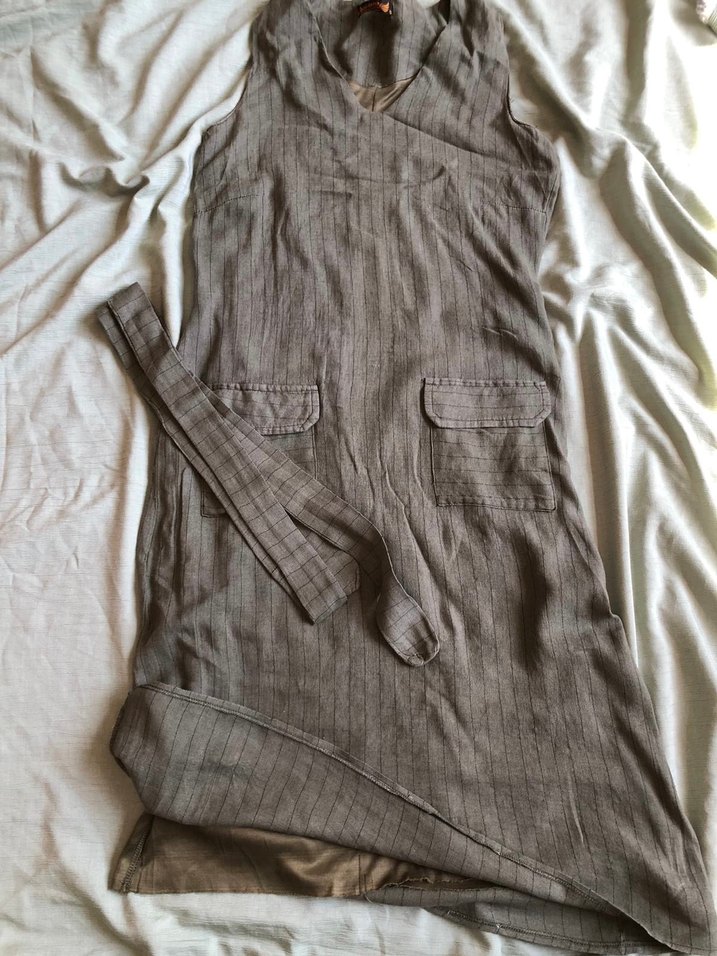Keten kumaştan, salaş kesim ve uzun boylu, kolsuz hamile tulumu. Kuşaklı ve yakalı, bej renkte, desensiz tasarım. Günlük rahat ve bohem tarzda.
