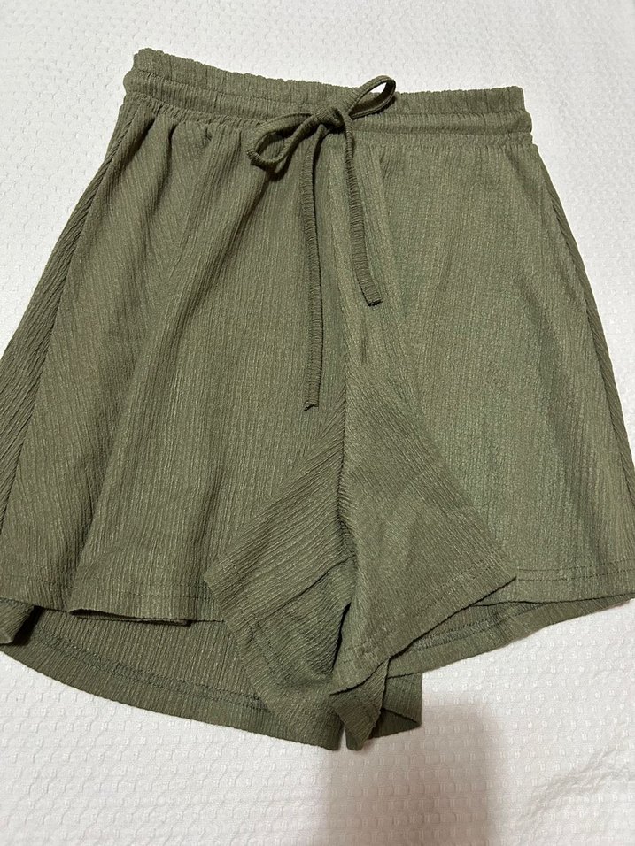 Yumuşak keten kumaştan yapılmış, salaş kesim ve kemerli yeşil şort. Günlük sokak tarzına uygun, rahat kullanım sağlar. Az kullanılmış kısıru yok